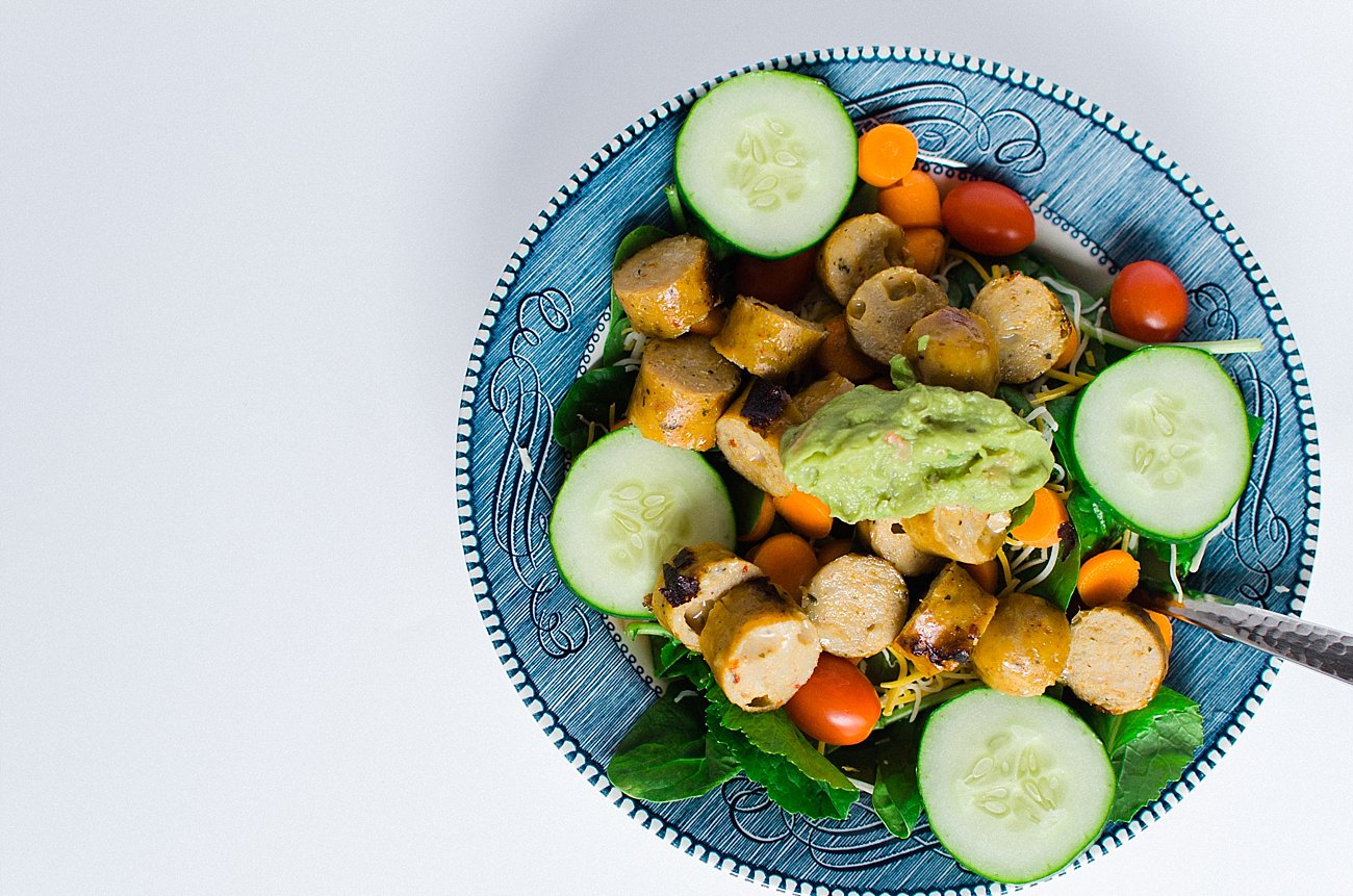 Chicken Sausage Dinner Salad With Avocado Pepperoncini Dressing