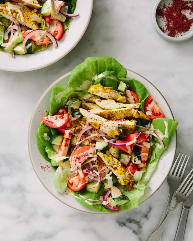 Chicken shawarma fattoush salad. Preheat oven to 350f. When all the oil has been added and the mixture starts to thicken season. Add the lettuce tomatoes parsley cucumber chicken pieces and spring onions and stir well to coat the salad in the dressing. Top with lettuce tomatoes cucumbers sliced avocado feta cheese and chicken skewers.