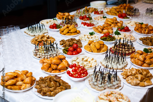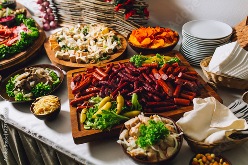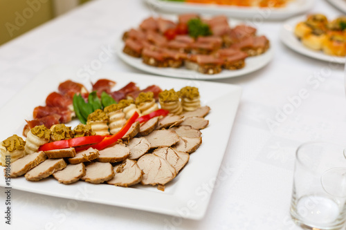 Buffet Table Of Reception With Cold Snacks Meat Salads And