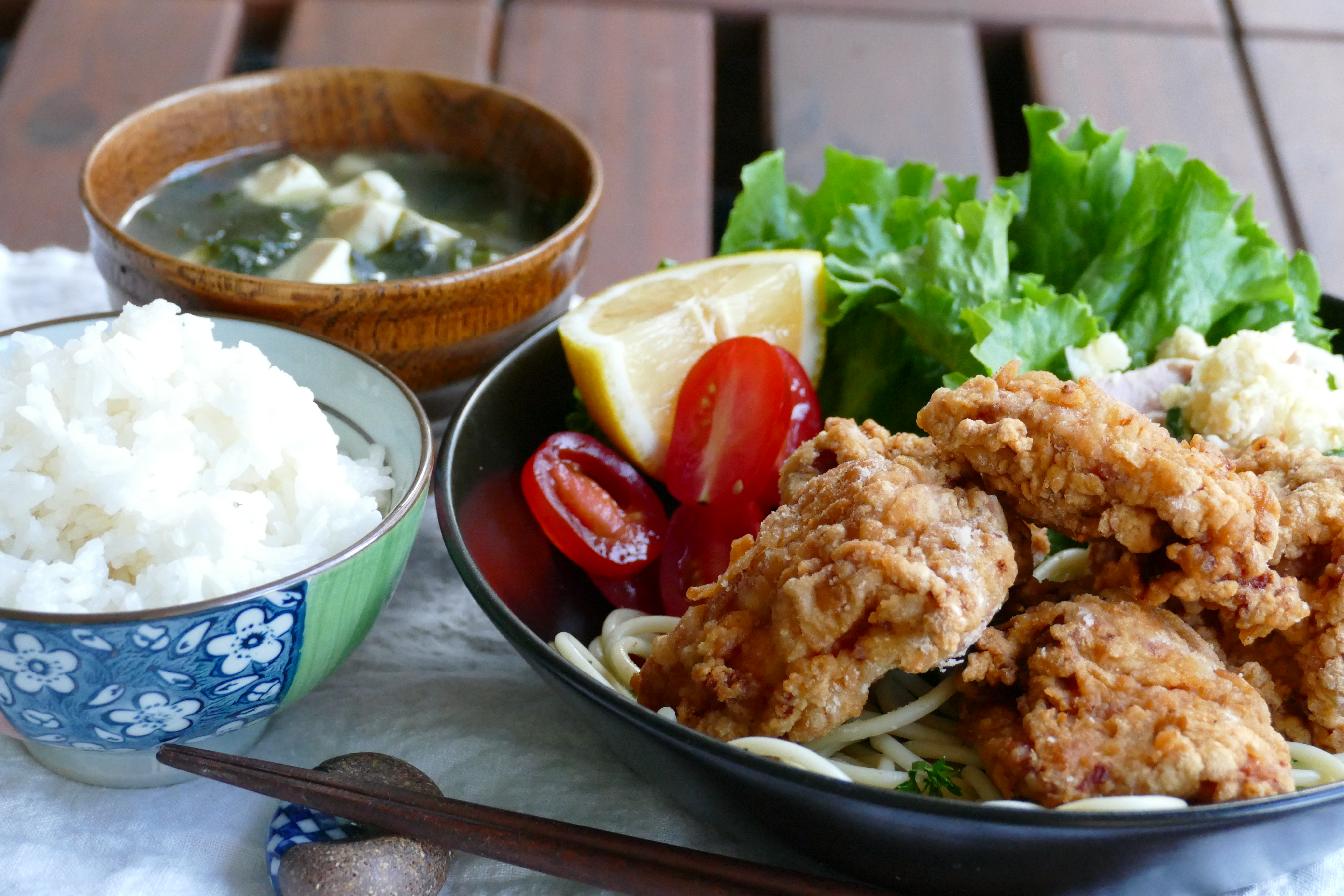 Crunchy Karaage Potato Salad And Seaweed Soup Deep Fried
