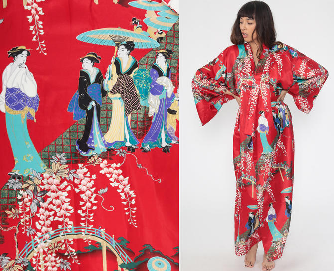 Geisha Kimono Red Robe Jacket Japanese Maxi Bohemian Wrap Asian
