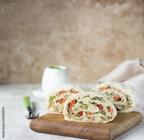 Tuna Salad Roll Sandwich On Wooden Cutting Board Roll Sandwich With Tuna Avocado Apples And Red Bell Pepper Thin Armenian Pita Bread Or Lavash Snack Buy This Stock Photo And Explore