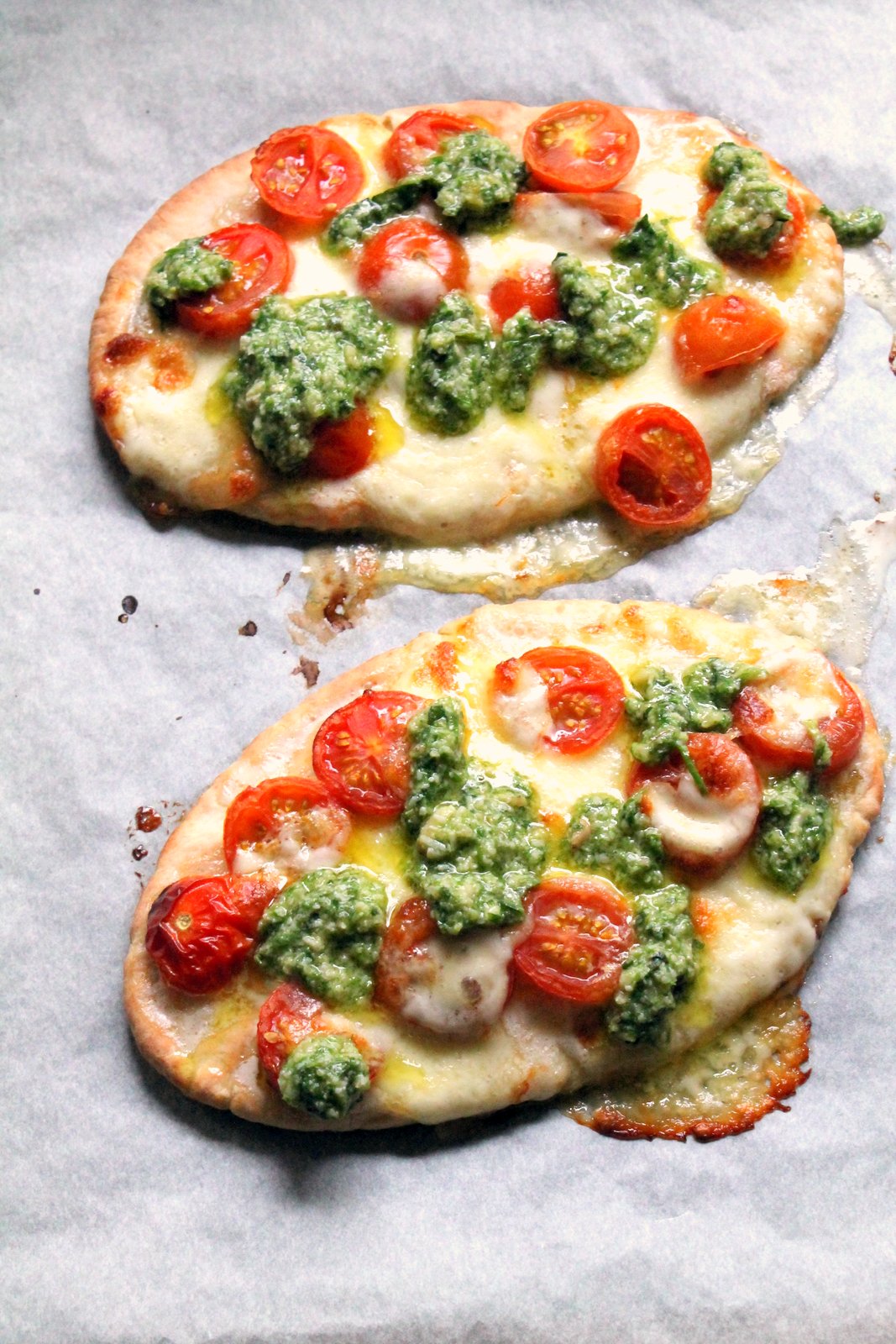 Caprese Pita Pizzas With Chive Pesto Happy Veggie Kitchen
