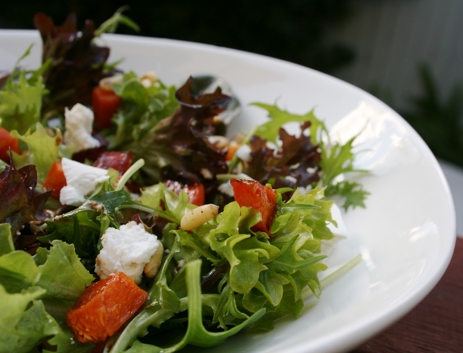 Toss pumpkin with olive oil salt and pepper. Wash and spin dry the spinach leaves. While the goat cheese is in the oven toast pumpkin seeds in a dry frying pan over fairly high temperature until they get some color and start to pop. Place pumpkin onto oven tray season with oil salt and pepper and roast for 15 18 minutes.