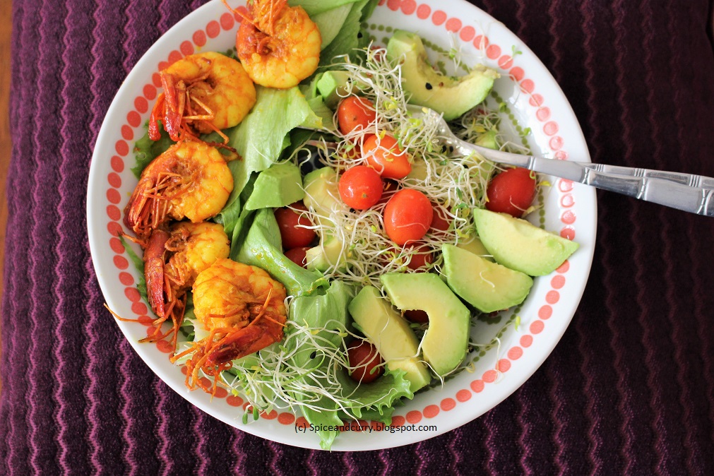 Spice And Curry Spicy Shrimp With Avocado And Alfalfa Sprouts Salad