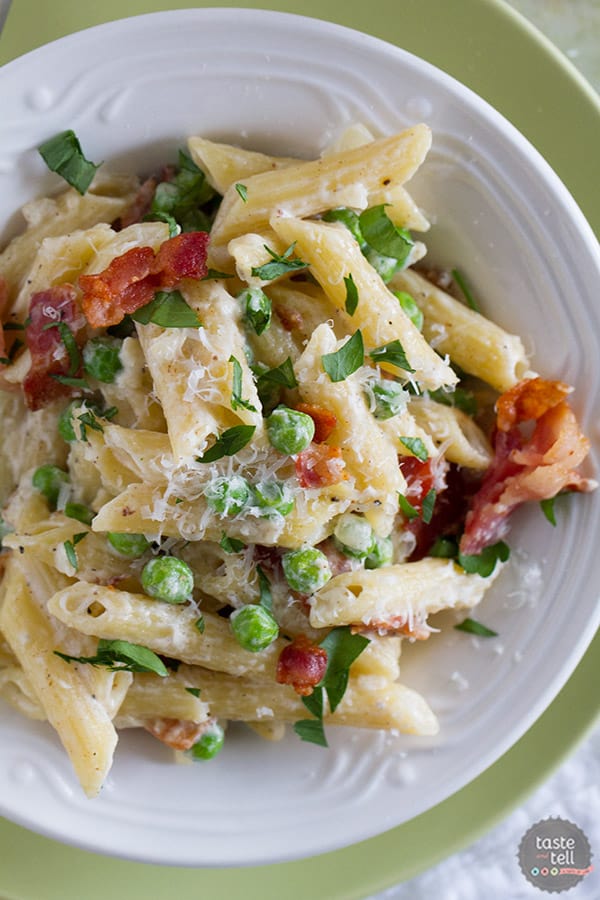 One Pan Pasta With Bacon And Peas Taste And Tell