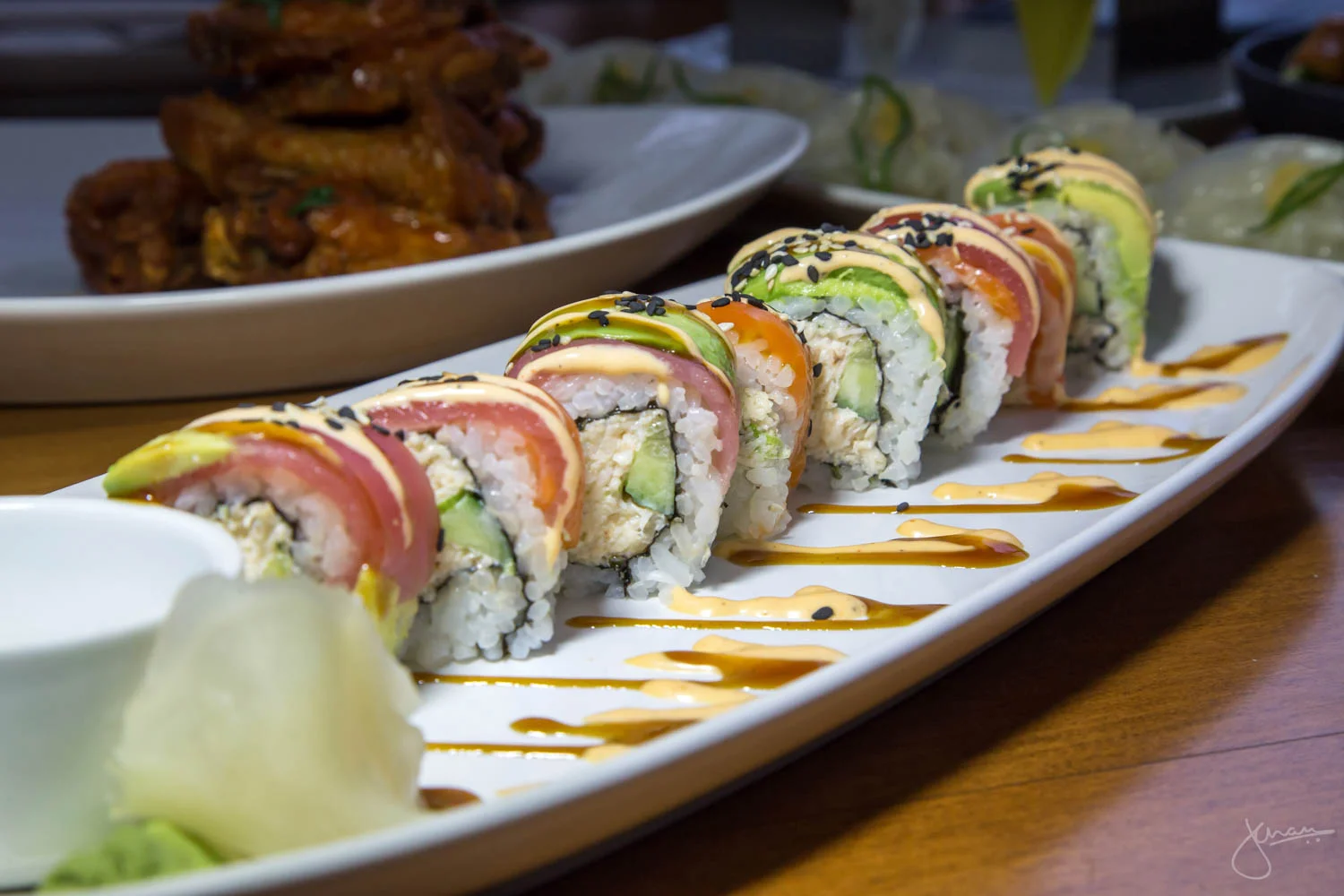 Rainbow Roll Ahi Tuna Salmon Crab Avocado Sriracha Aioli